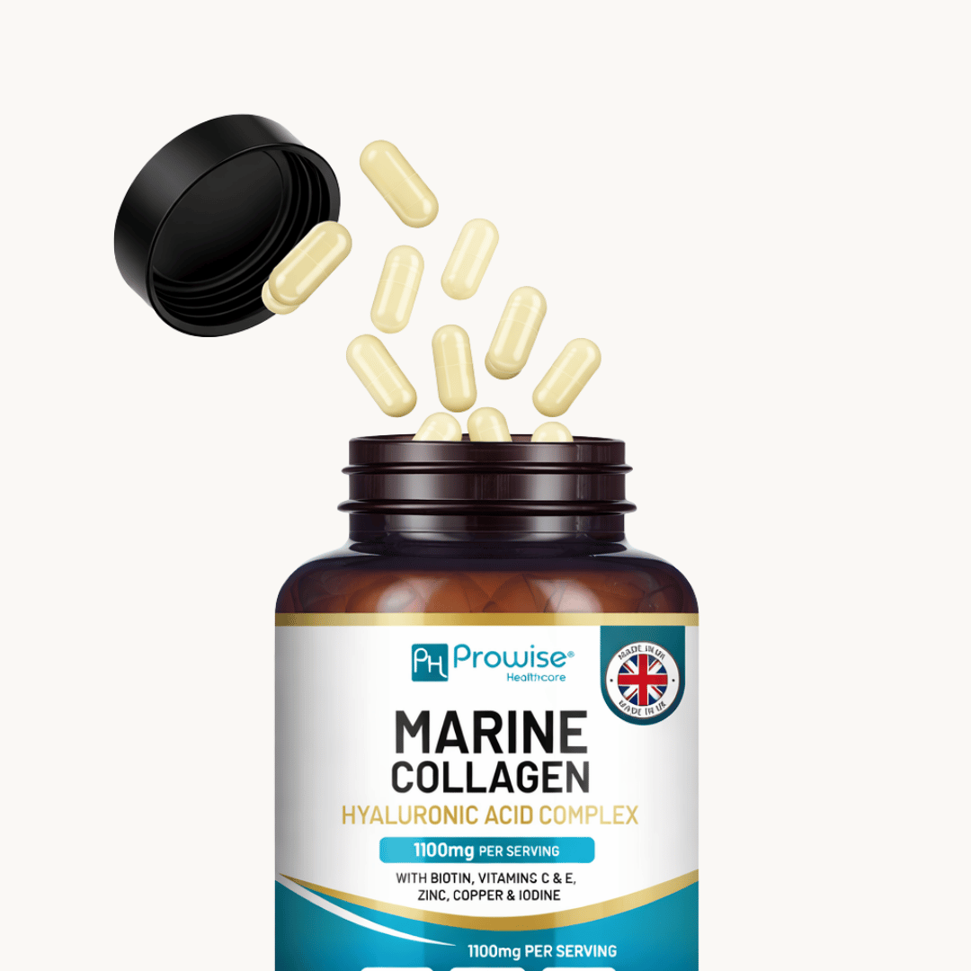 Prowise UK Marine Collagen & Hyaluronic Acid Capsules combine type I hydrolysed marine collagen peptides with hyaluronic acid, vitamins, and trace minerals in a convenient daily supplement.