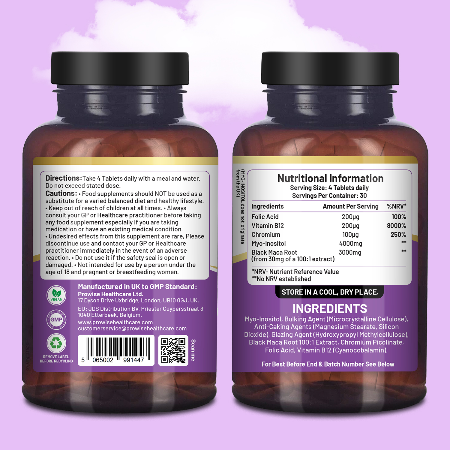Myo-Inositol, Black Maca Root 100:1 Extract, Chromium Picolinate, Folic Acid, Vitamin B12 (Cyanocobalamin), Bulking Agent (Microcrystalline Cellulose), Anti-Caking Agents (Magnesium Stearate, Silicon Dioxide), Glazing Agent (Hydroxypropyl Methylcellulose).