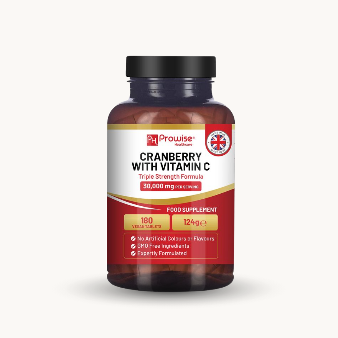 Support urinary tract and immune health with Prowise UK Triple Strength Cranberry, delivering the equivalent of 30,000mg cranberry per daily serving, enriched with Vitamin C and suitable for both women and men.