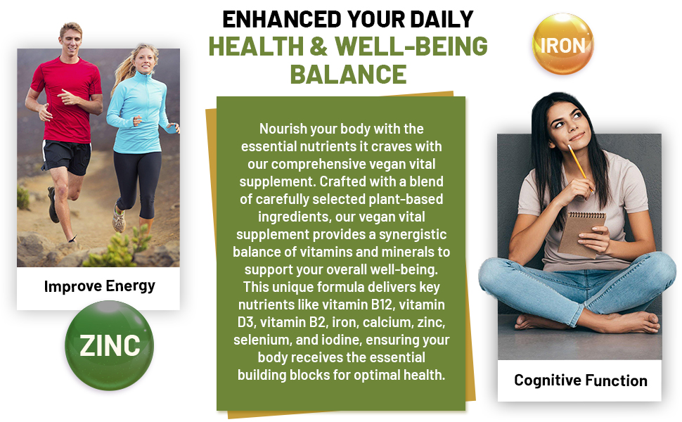 This balanced formula provides 8 essential vitamins, minerals, and trace elements, including Vitamin B2, B12, D3, Calcium, Iron, Zinc, Selenium, and Iodine, nutrients that are commonly considered in vegan nutrition.
